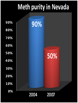 Meanwhile, the DEA reports that meth is the most frequently encountered drug in Nevada and remains available in both personal-use and distribution quantities. Nevada is both a point of importation and a transshipment location for methamphetamine. The manufacture of methamphetamine in Nevada occurs on a limited basis. The meth imported into the state is produced primarily in "super labs" (producing 10 pounds or more in a 24-hour period) by ethnic